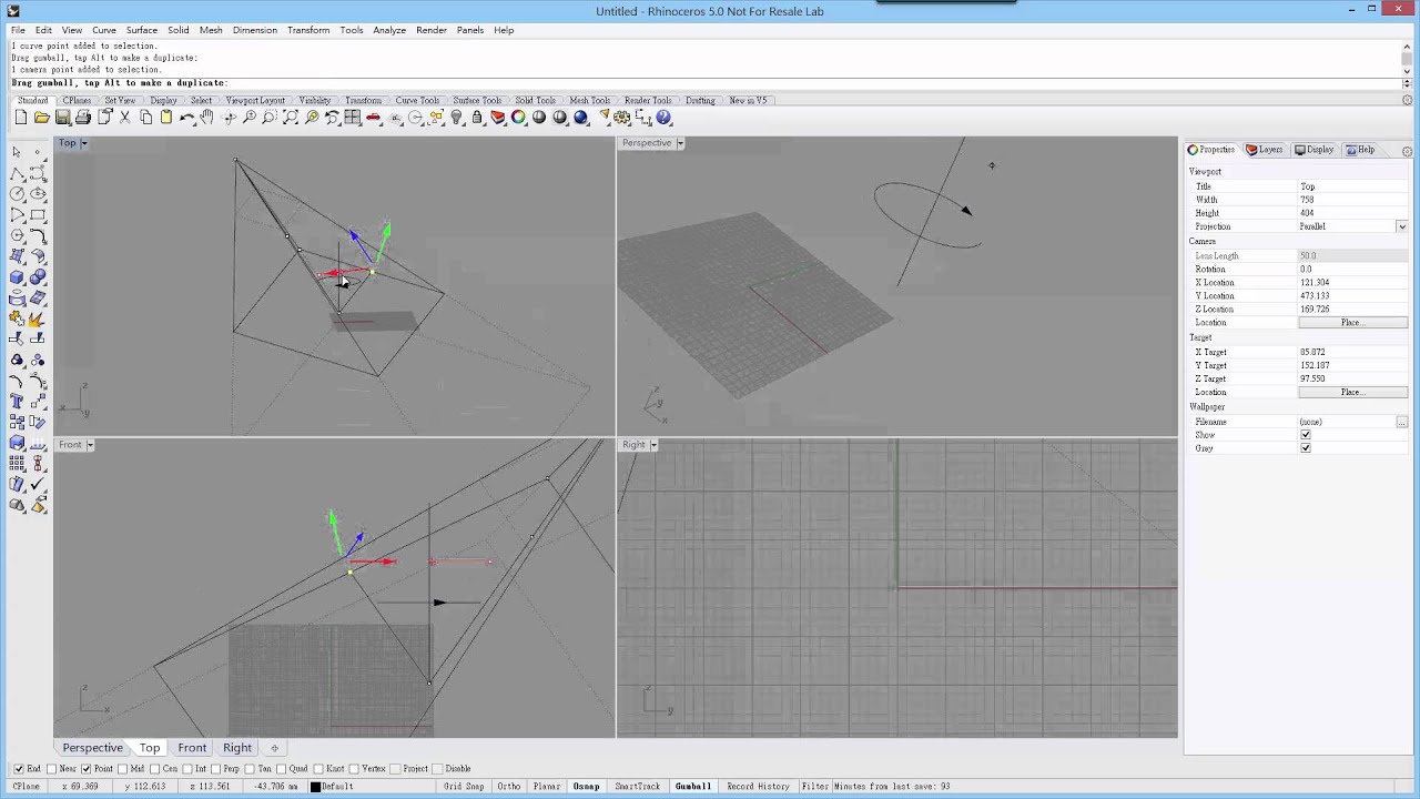 這是因為 Rhino 視圖水平旋轉時總是繞著通過攝影機目標點的世界 Z 軸旋轉,和 CPlane 的定位無關,當你的視圖或模型是傾斜的時候就會有失去平衡的感覺。視圖傾斜時 - 可以用 Shift + Alt + 滑鼠右鍵,把視圖的垂直中心線轉到和世界 Z 軸差不多的角度。模型傾斜時 - 要把模型重新定位到 CPlane 上,這樣旋轉視圖就不會有那種感覺。